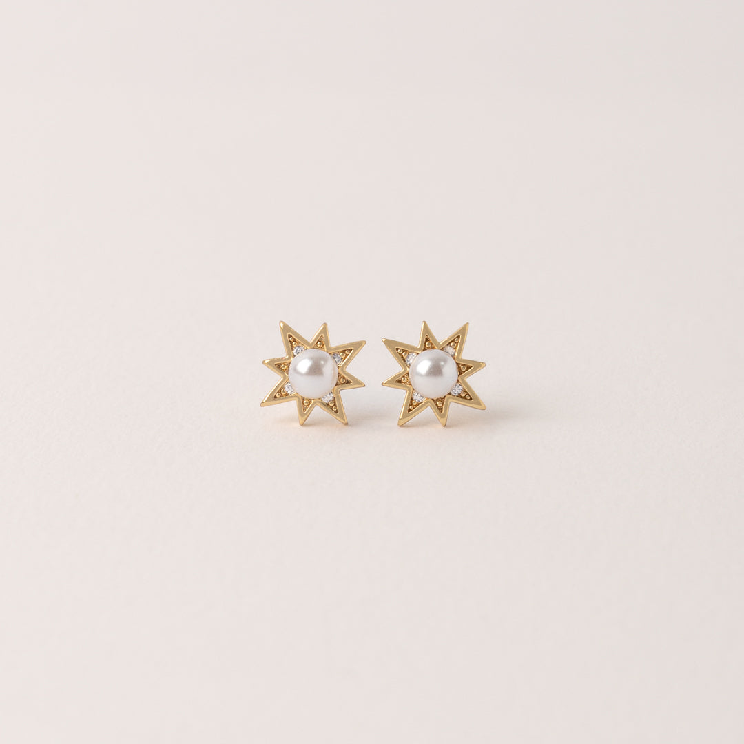 Nuestros Aurora Pearl en forma de estrella de ocho puntas, elaborados en acabado dorado. Al centro llevan una perla blanca que aporta un toque clásico y cómodo, mientras que pequeños detalles brillantes enmarcan la pieza para darle mayor luminosidad.