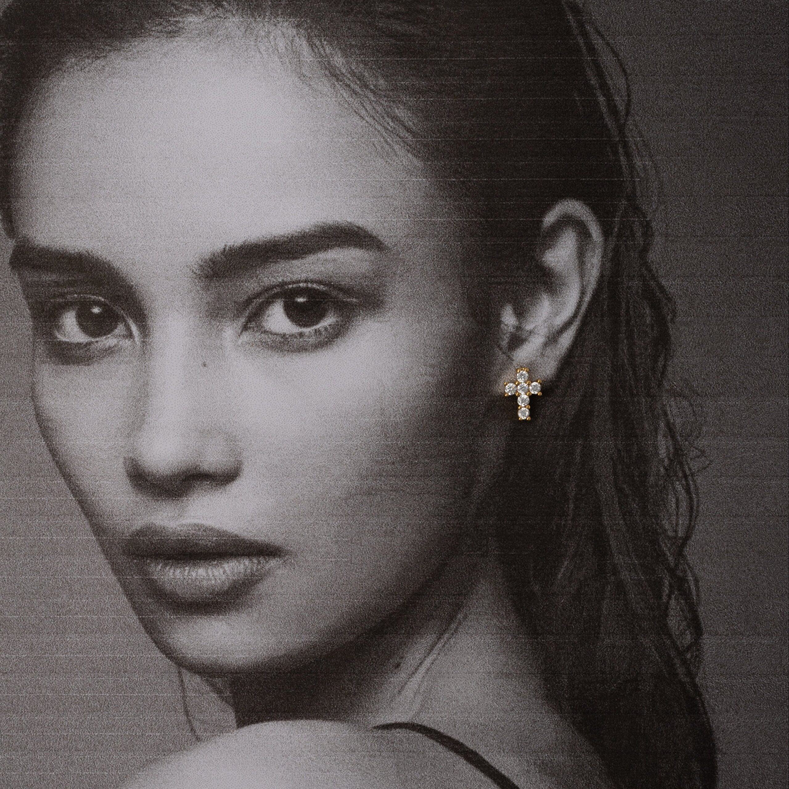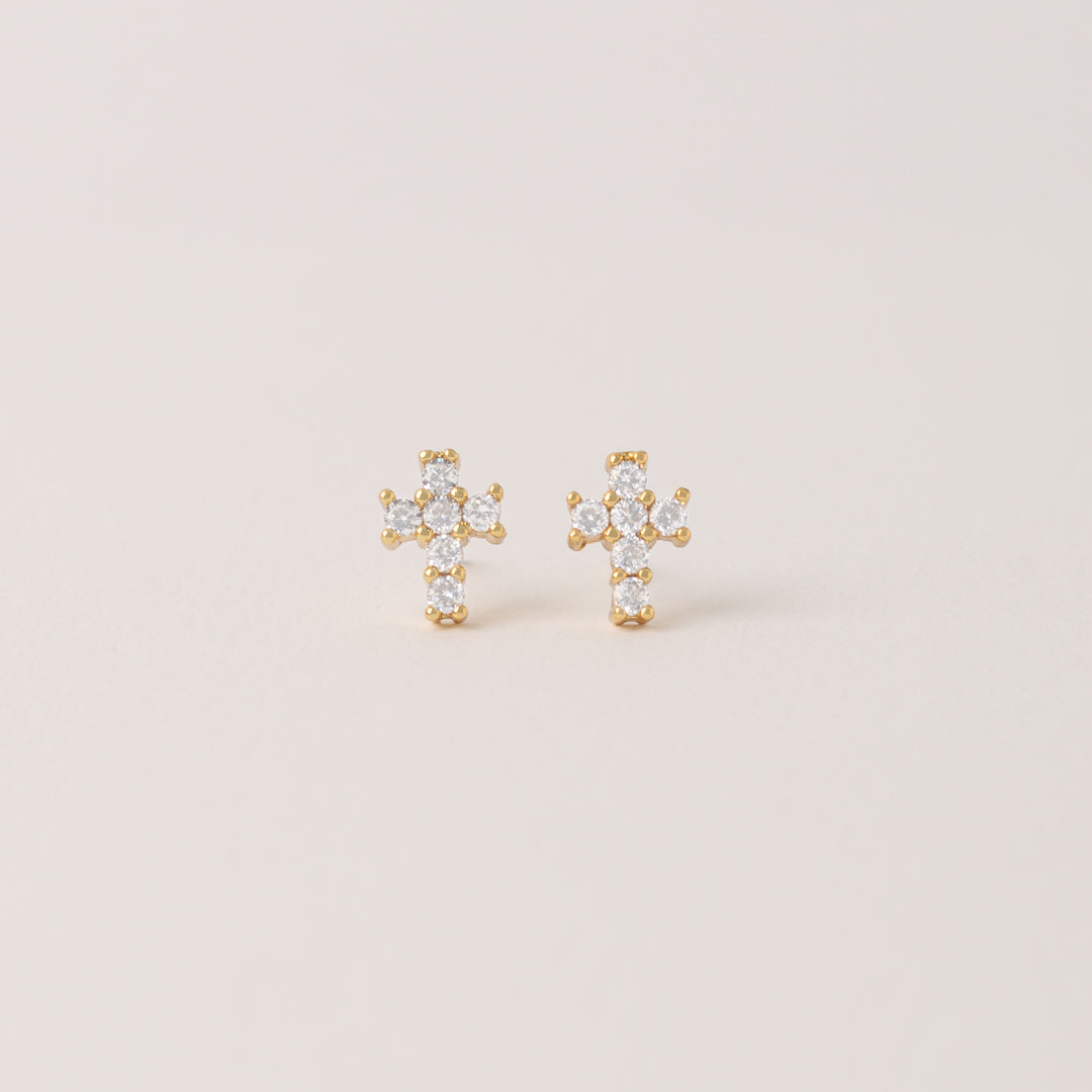 Nuestros Aretes Luz Sagrada presentan un delicado diseño en forma de cruz con acabado dorado, realzado con circonias blancas que aportan un destello sutil y elegante. Su estilo, moderno y a la vez simbólico, los convierte en el accesorio ideal para lucir a diario o en ocasiones especiales.