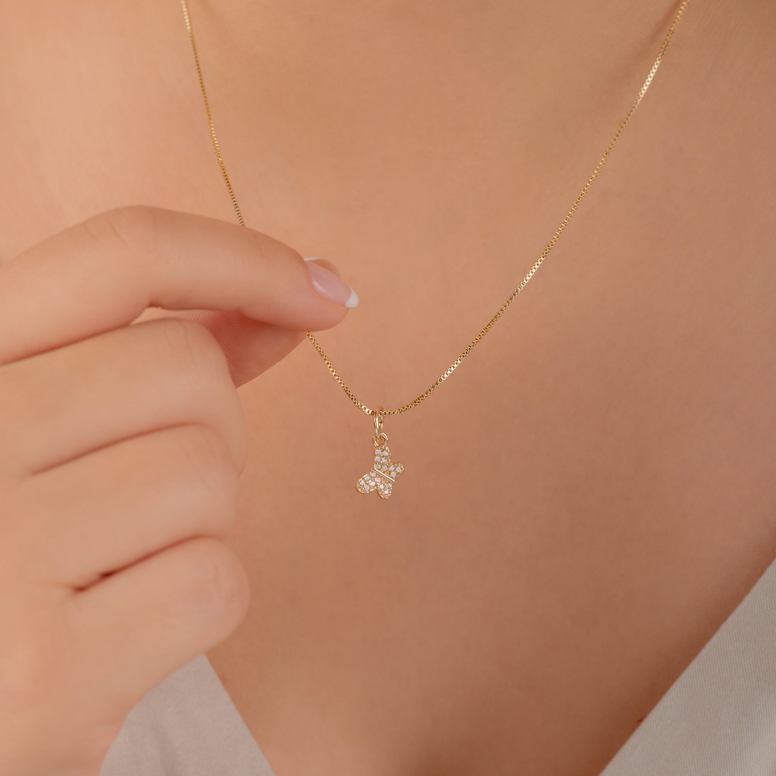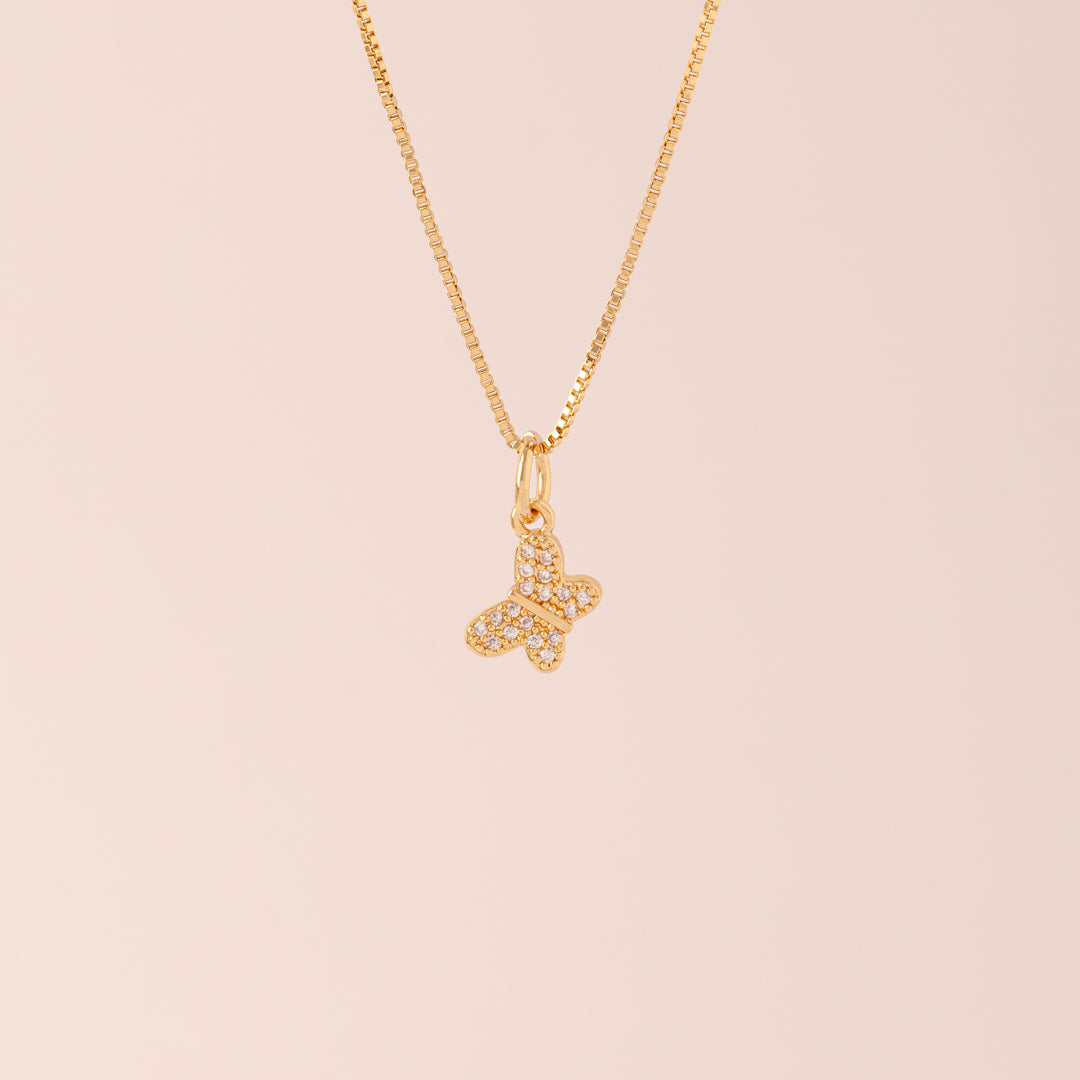 Nuestro Collar Aurora Flutter con un pequeño dije de mariposa, perfecto para uso diario o para complementar looks más elaborados con sutileza y encanto.