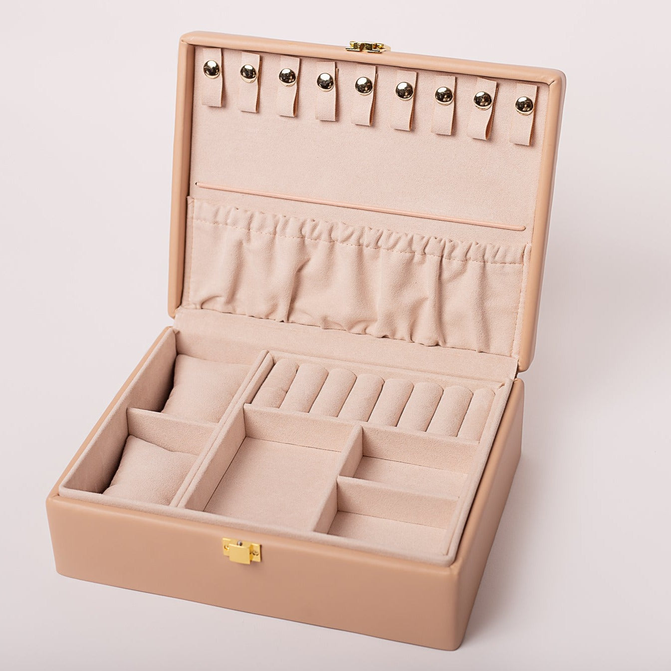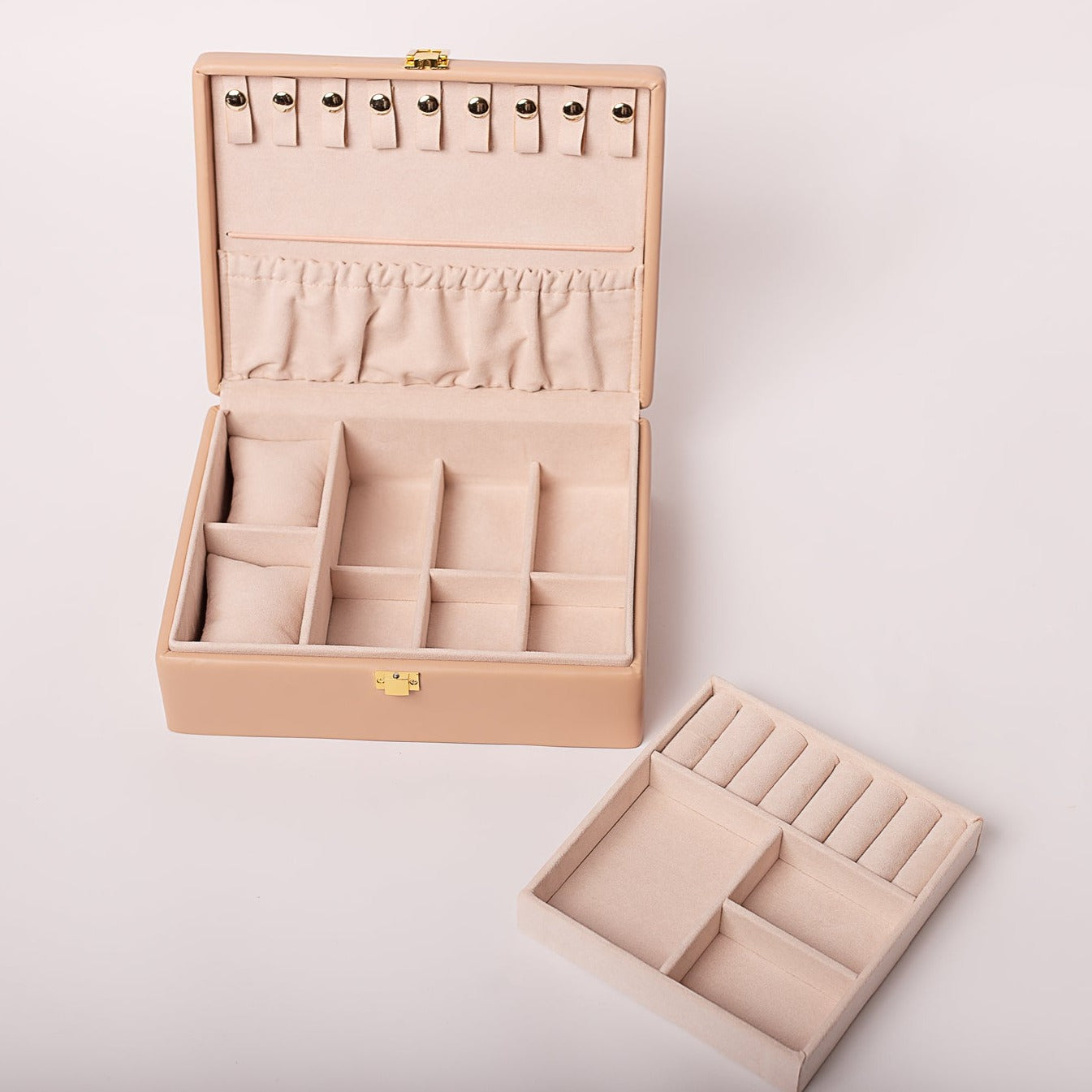 Organiza tus joyas con estilo en este sofisticado Joyero XL forrado en cuerina de alta calidad. Su textura suave y acabado elegante lo convierten en el complemento perfecto para tu tocador o para llevar tus joyas de viaje. Cuenta con compartimentos funcionales para anillos, aretes, collares y pulseras, manteniéndolos protegidos y siempre a la mano. Práctico, compacto y con un diseño moderno que refleja buen gusto.