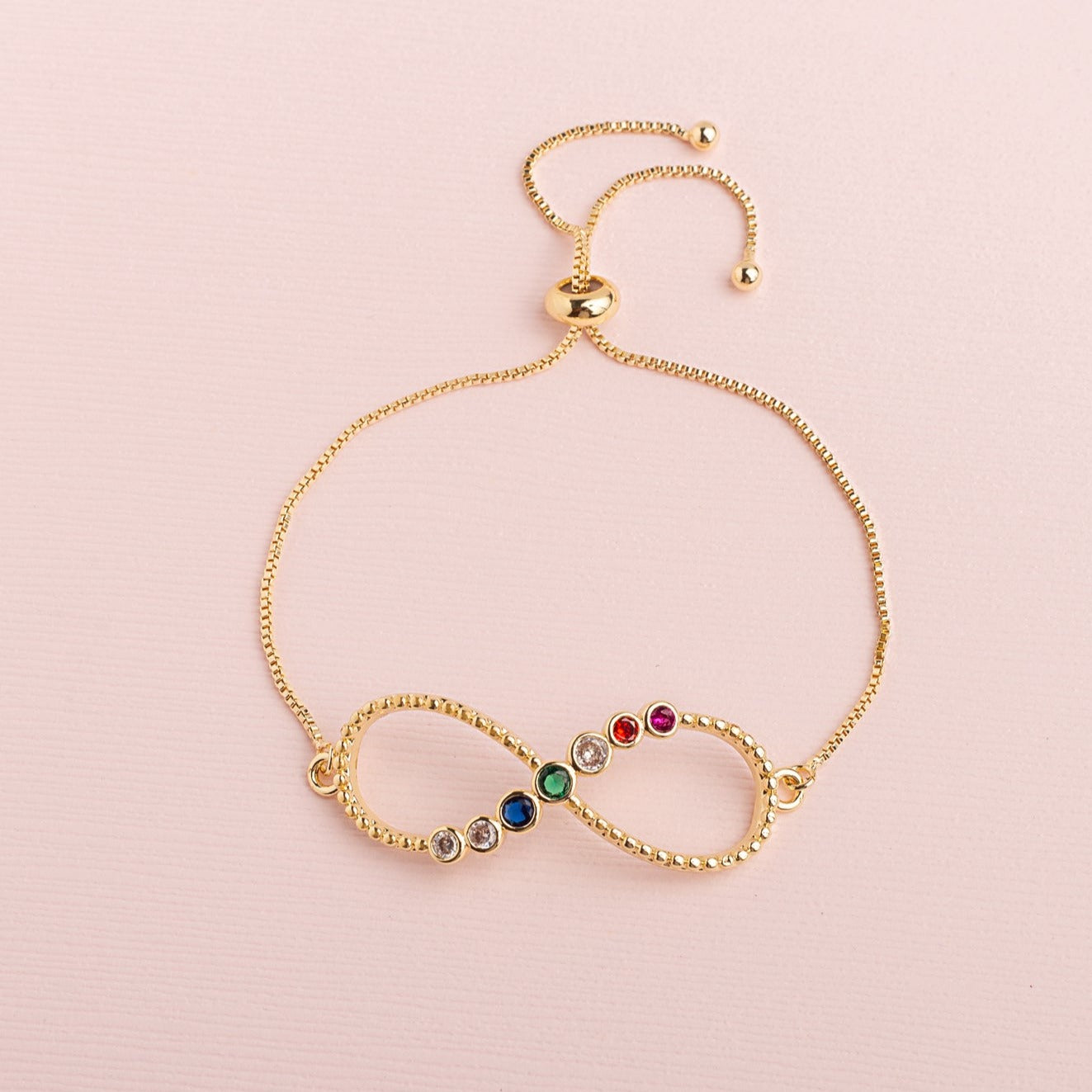 El centro de la pulsera presenta un elegante símbolo de infinito, finamente elaborado y adornado con una serie de brillantes cristales de colores. El infinito es un símbolo que puede representar el amor incondicional, las metas personales sin fin, o simplemente la idea de que la vida está llena de infinitas oportunidades y posibilidades.