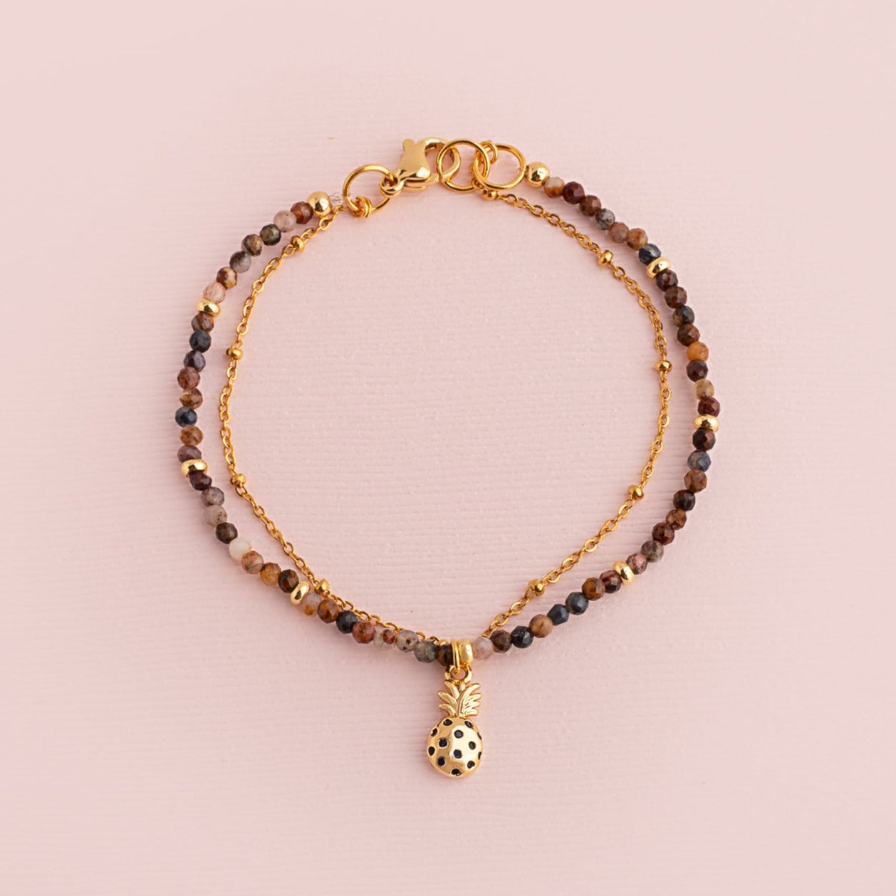 Dale un toque fresco y tropical a tu estilo con nuestra pulsera con dije de piña. Un símbolo de alegría, vitalidad.