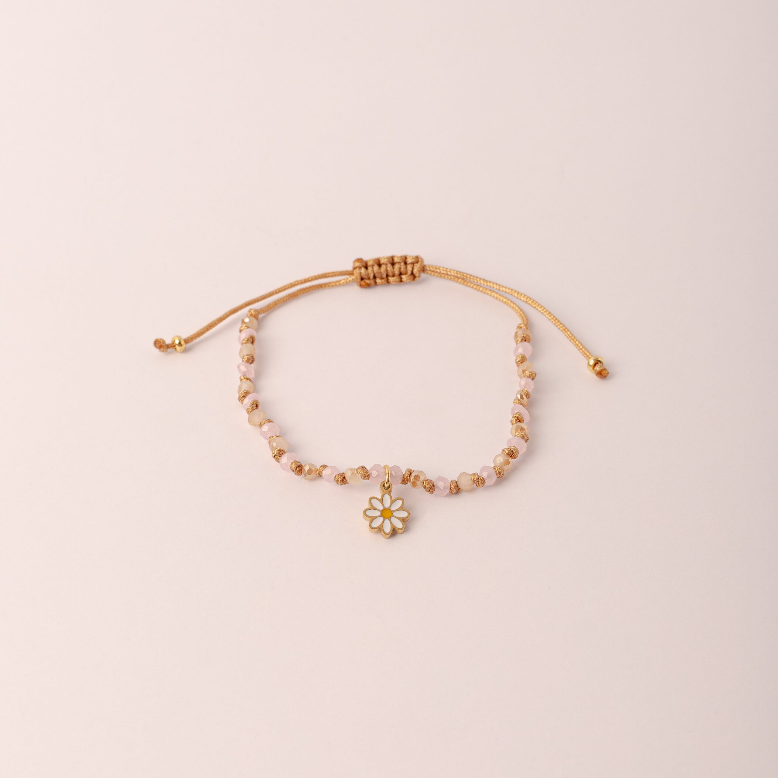 Nuestra Pulsera Vera Hilo Nudo Margarita dulce y encantadora, esta pulsera está elaborada con muranos en suaves tonos rosados que evocan ternura y armonía. El detalle especial lo aporta un delicado dije de margarita, símbolo de pureza, alegría y nuevos comienzos.